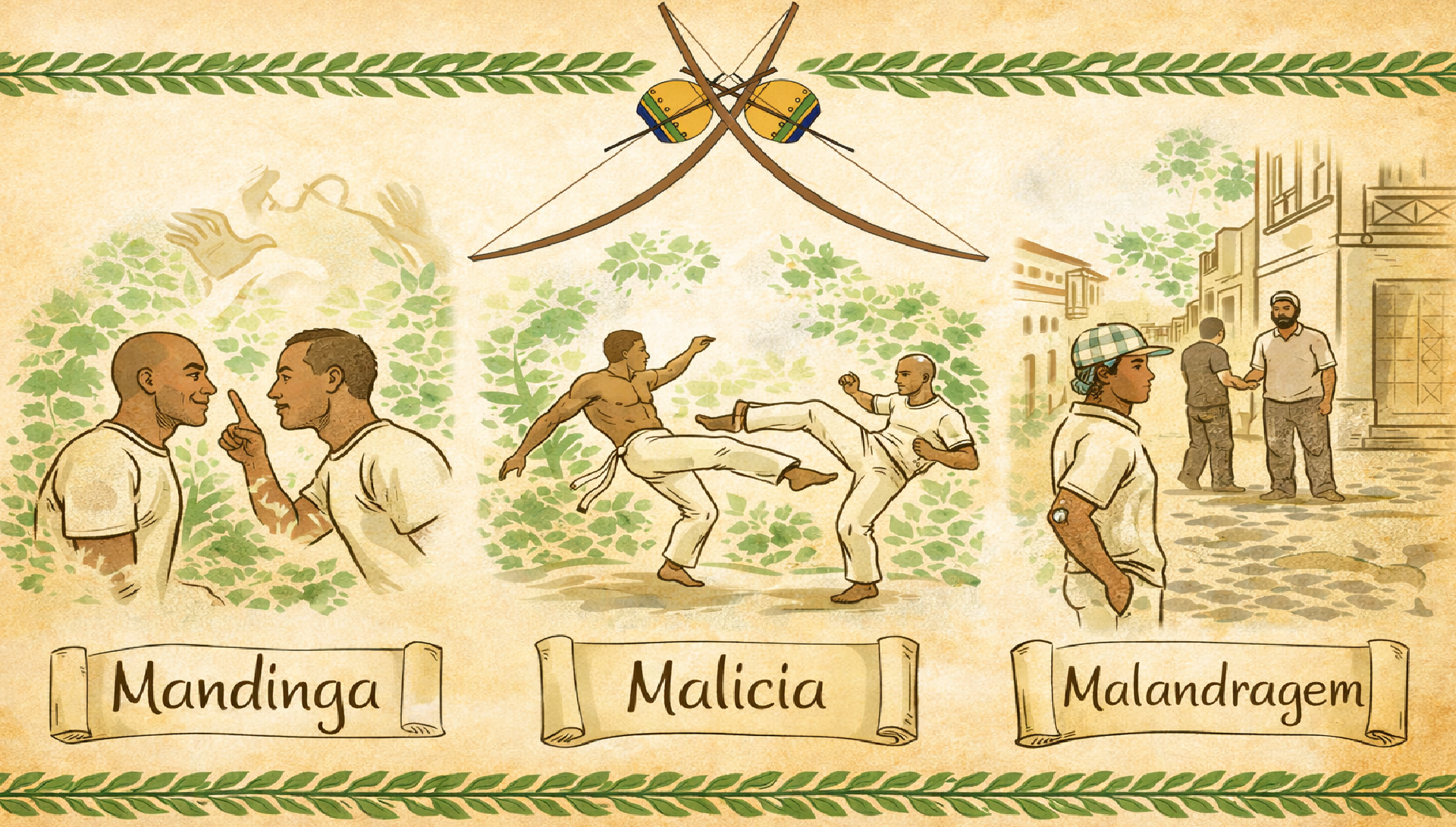 Then there is malandragem. The most social of the three. The most dangerous, and the most human. Malandragem carries the streets of Brazil within it: the ports, the neighborhoods, the cafés, the music, the poverty. It is the art of moving between rules without openly breaking them. It is not immorality; it is adaptability. The ability to remain standing in a world that does not want you standing. In Capoeira, malandragem is the smile that hides experience, the relaxed step that is actually precise and calculated.